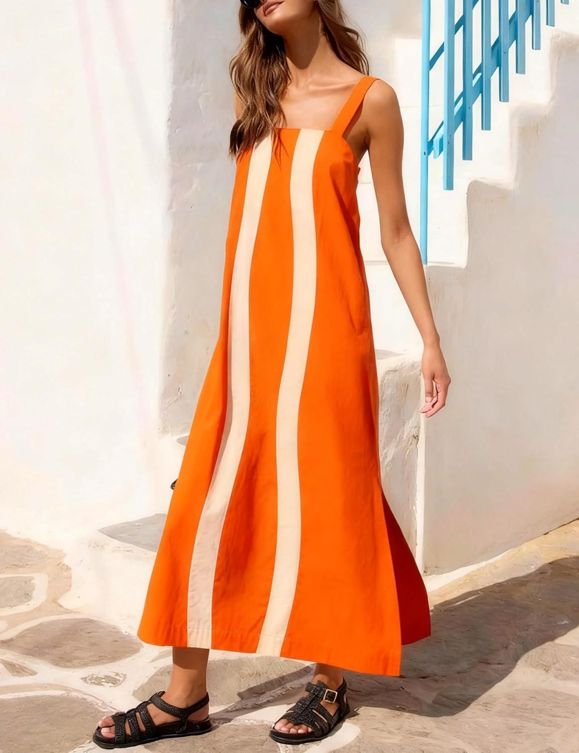 Ailoqing 2026 Women Boho Floral Dress Summer Casual Color Block Maxi Beach Vocation Overall Dresses Coverups(Orange)