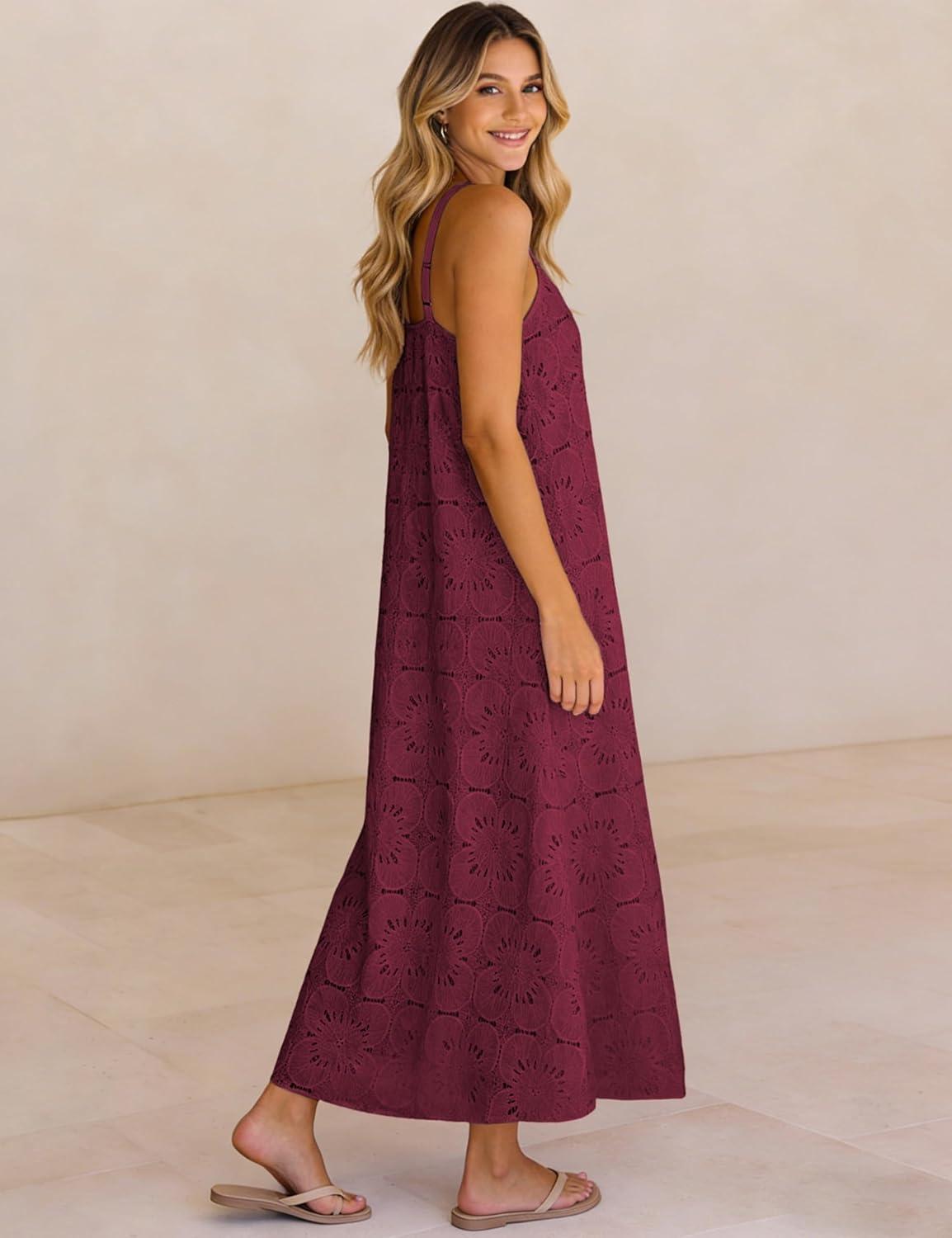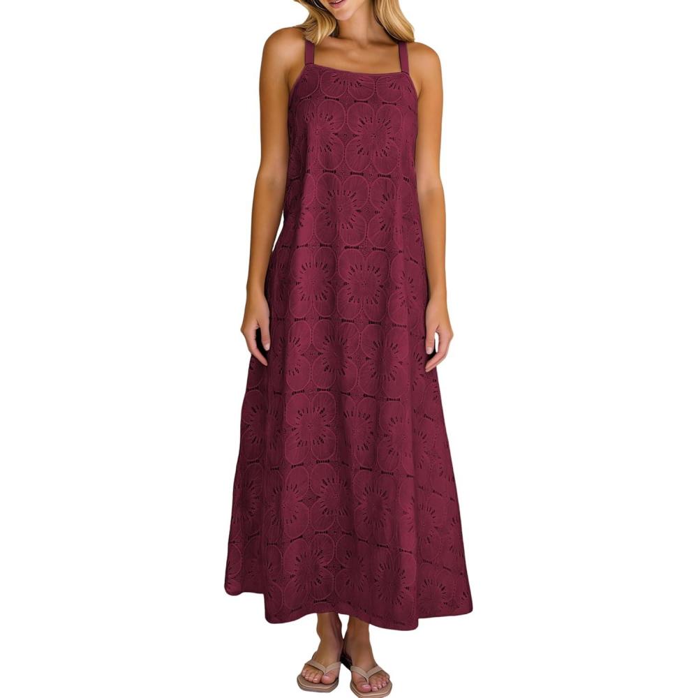 Ailoqing 2026 Womens Summer Boho Sundress Casual Sleeveless Floral Lace Beach Vocation Maxi Dress(Winered)