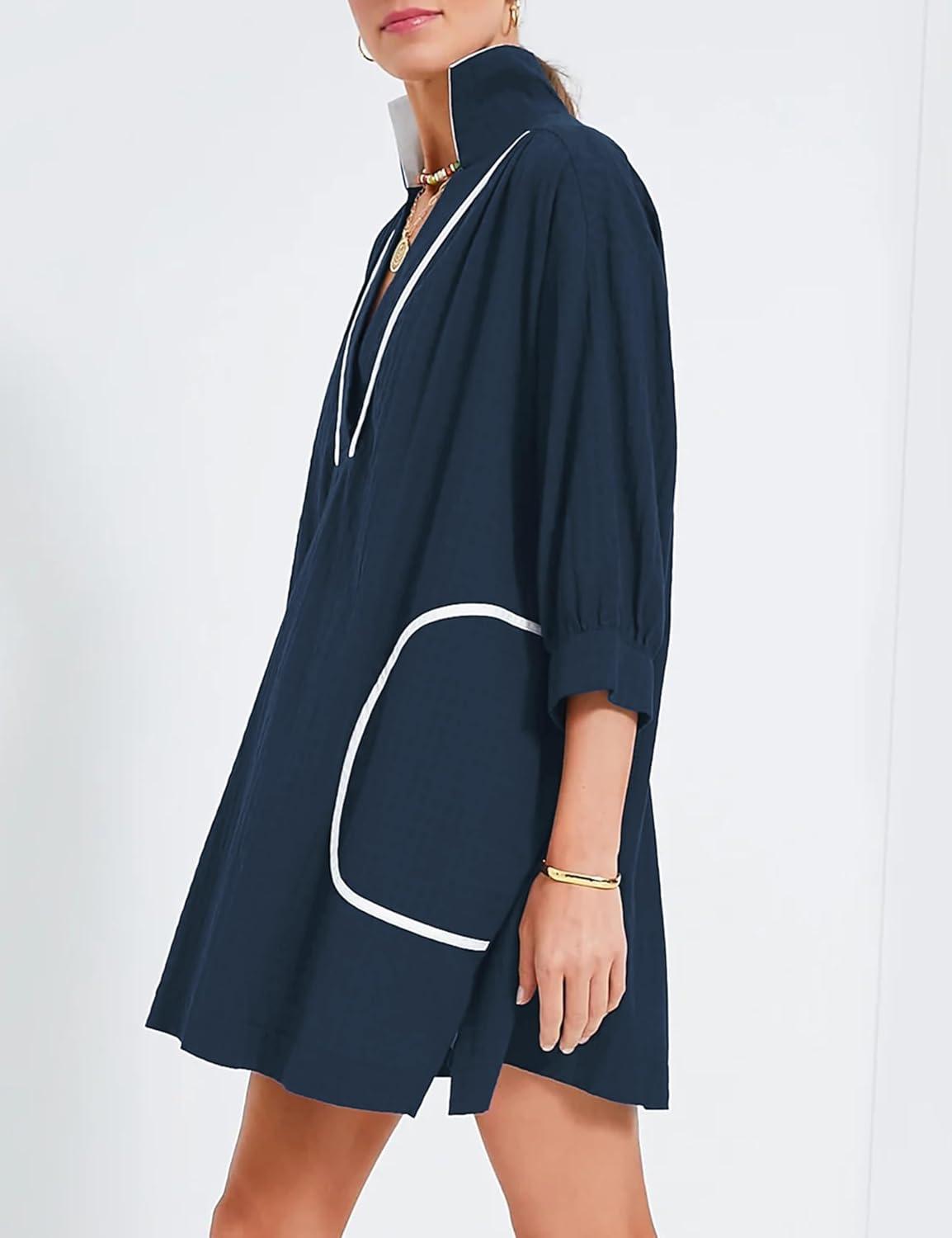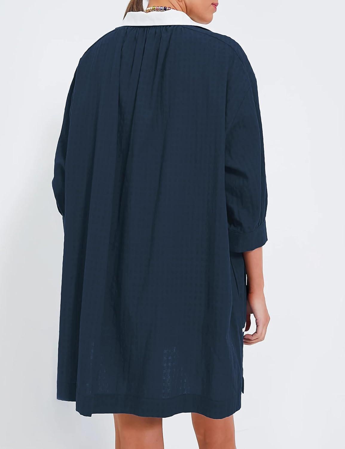 Ailoqing Swimsuit Coverup Womens V Neck 3/4 Sleeve Casual Shirt Dress with Pockets(Navy)