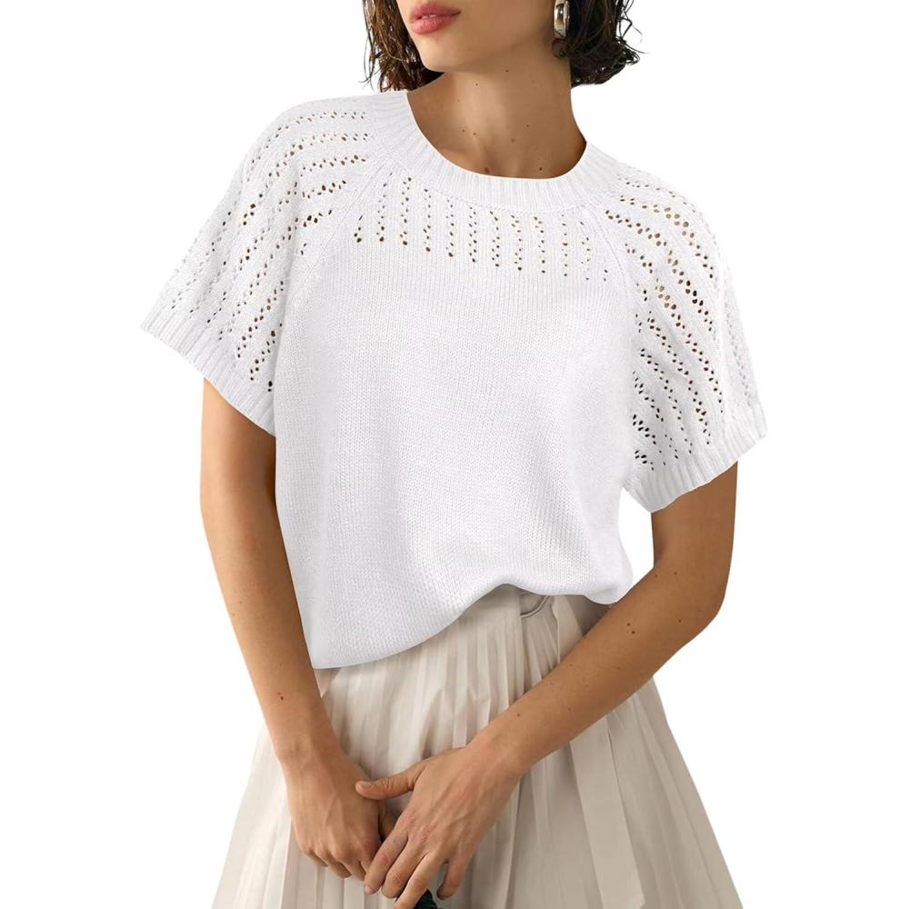 Ailoqing Knitted Short Sleeve Sweaters 2025 Lightweight Sweater Knit Tops Shirts Solid Hollow Out Blouses(White)