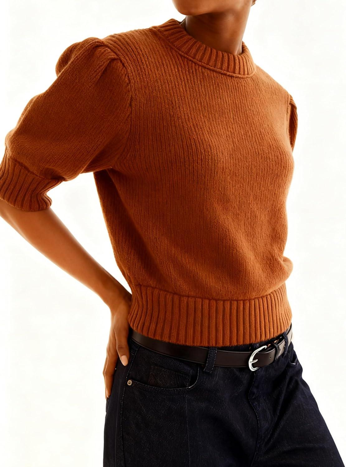 Ailoqing Casual Women's Short Sleeves Pullover Sweater Lightweight Crewneck Cropped Knit Jumper Tops(Brown)